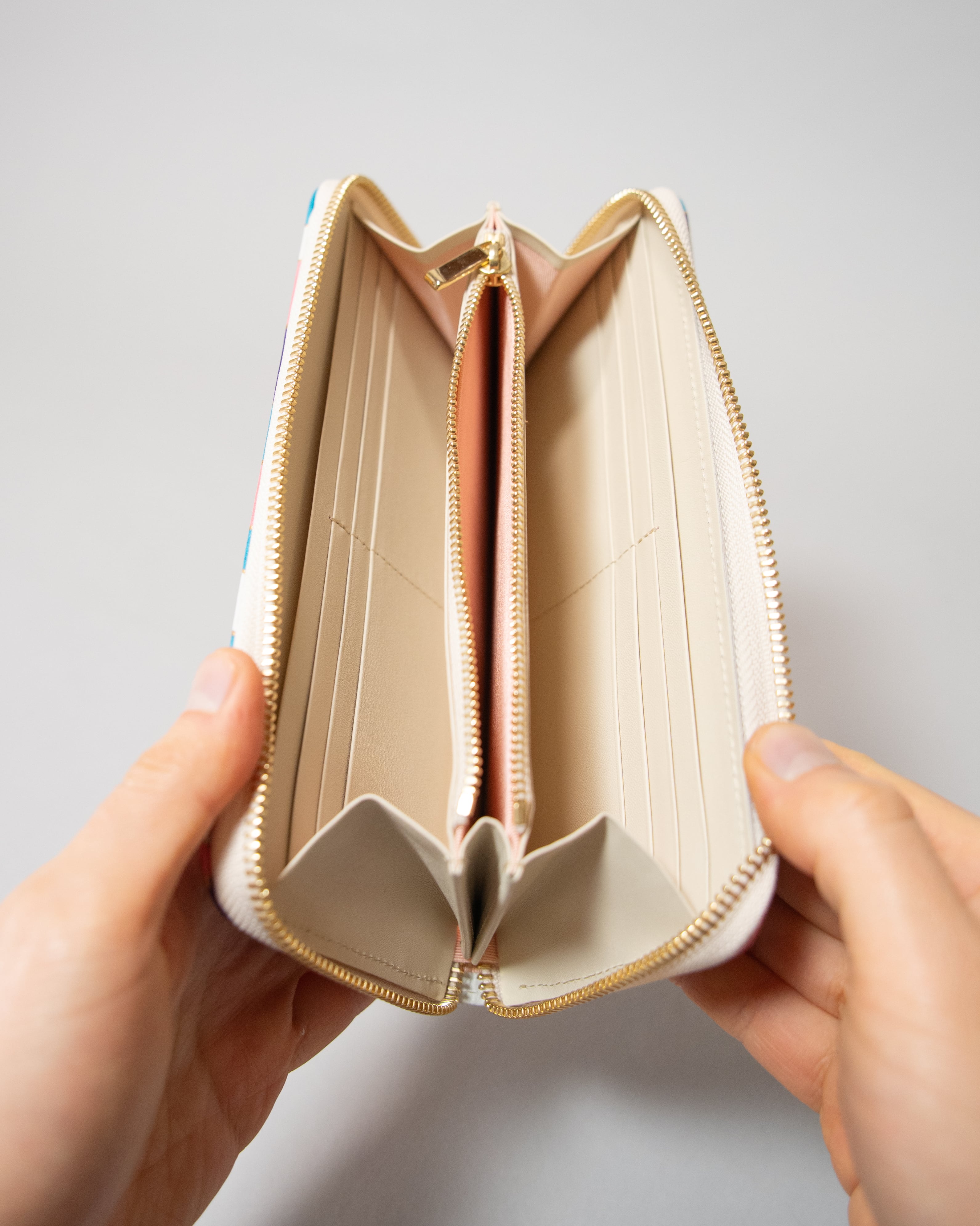 豊富なお札入れ、ジッパーで開く小銭入れ、左右に配置されたカード入れなど、シンプルながら機能性と利便性を備えたラウンドジップ仕様の長財布。ファスナー式の小銭入れを中心に2層に仕切られた使いやすい構造。両サイドのお札入れ内部にカードホルダーが4つ備わっています。